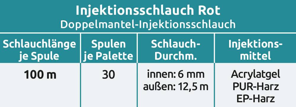 Der Injektionsschlauch Rot ist ein robuster, flexibler und langjährig erprobter Doppelmantel-Injektionsschlauch für polymere Füllstoffe zur Ausbildung wasserdichter Betonfugen. Ein schwarzer, gestanzter PVC-Innenschlauch wird ummantelt von einer Lage Baumwollgeflecht und einer zweiten Lage Monofil als Schutzgewebe. Der Schlauch ist auf eine Pappspule aufgerollt, je Spule beträgt die Schlauchlänge 100 m. Je Palette sind 30 Spulen (3.000 m) in Schrumpffolie eingeschweißt.