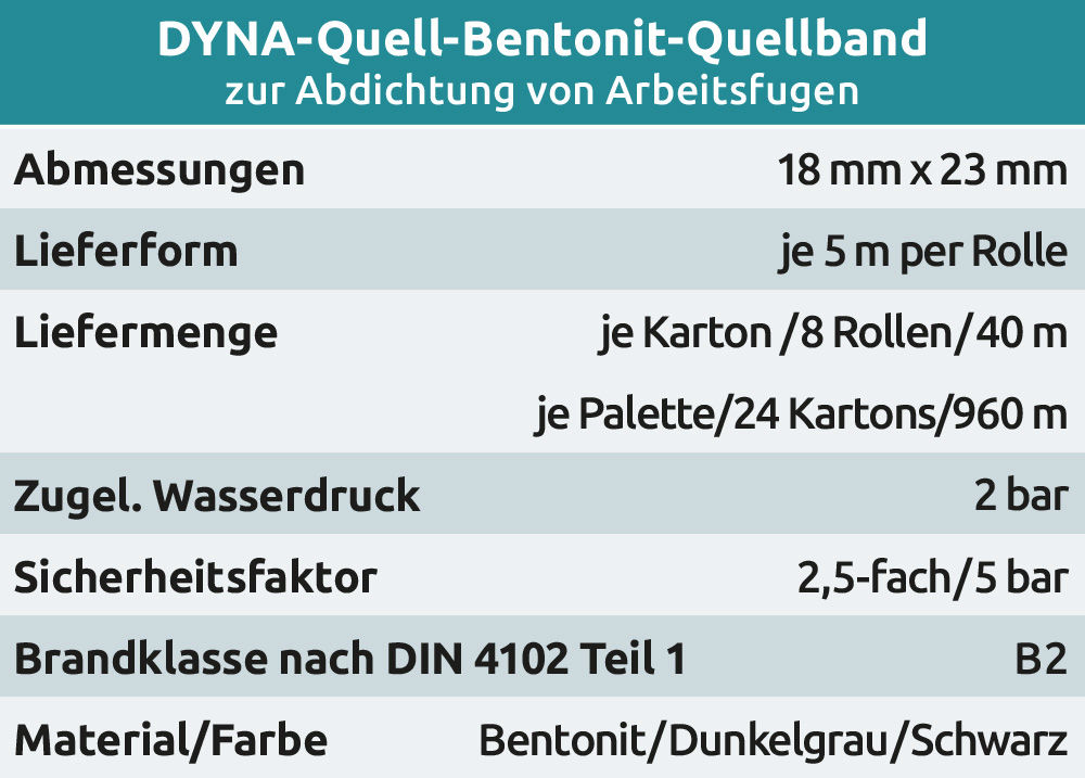 DYNA-Quell ist ein quellfähiges Fugenband auf Bentonitbasis, das zur Abdichtung von Arbeitsfugen gegen drückendes und nichtdrückendes Wasser eingesetzt wird. Im eingebauten Zustand entsteht ein Quelldruck, der die Abdichtung erzeugt. Das plastische Material nimmt Bewegungen der Fuge auf, ohne die abdichtende Wirkung zu beeinflussen.